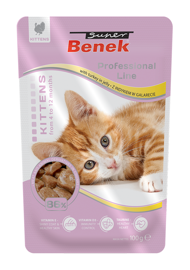 SUPER BENEK Saszetka dla młodych kotów – Indyk w galarecie (100g) to smaczny i zdrowy wybór dla Twojego rosnącego kociaka. Daj swojemu małemu przyjacielowi najlepszą opiekę, dbając jednocześnie o jego przyjemność podczas jedzenia. To pyszna i odżywcza karma, która pozwoli Twojemu kotu rozwinąć się w zdrowego i szczęśliwego dorosłego kota.